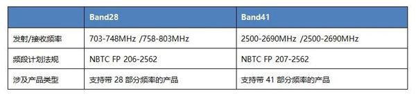 2020年10月26日,NBTC决定驳回仅支持Band 28和Band 41部分频段的WWAN用户设备申请。